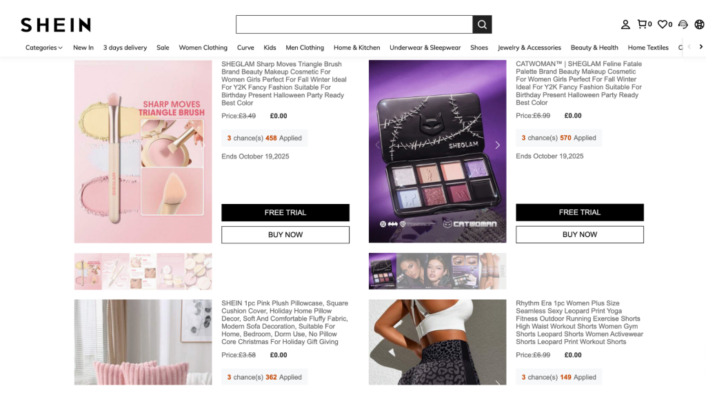 Nesta captura, os produtos exibem o valor £0.00, pois o exemplo foi feito a partir de uma versão internacional do site. O formato da página é o mesmo em quase todos os países, mudando apenas a moeda local e o idioma. Cada item mostra o preço original, o prazo da oferta, o número de vagas disponíveis e os botões “FREE TRIAL” e “BUY NOW”, exatamente como aparecem na plataforma oficial da SHEIN.